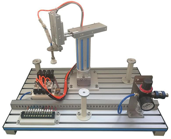 模型由回轉(zhuǎn)氣缸、雙軸氣缸、單軸氣缸、吸盤、真空發(fā)生器、電磁閥、節(jié)流閥、手滑閥、減壓閥、磁性開關(guān)、機械部件、工業(yè)鋁合金型材底板等組成,設(shè)有兩個抓取工位,可進行工件取放控制練習。可開展對氣動機械手的操作及編程控制訓練。配有空氣壓縮機:靜音無油,工作電源AC220V±10% 50Hz,輸入功率0.68kW;公稱容積24L,理論流量:116L/min,額定輸出氣壓0.7MPa。