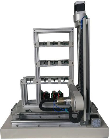 模型包含三層九倉位庫體、出/入庫倉位庫體、三維(X、Y、Z)運動機械及電氣控制等部分組成;定位執(zhí)行機構(gòu)由豎軸和橫軸組成;驅(qū)動機構(gòu)由步進電機及步進電機驅(qū)動器組成;傳動軸為滾珠絲桿傳動和雙軸導(dǎo)軌帶傳動,傳動平穩(wěn)。取物軸由直流減速電機驅(qū)動,可實現(xiàn)前后兩方向的運動。 |