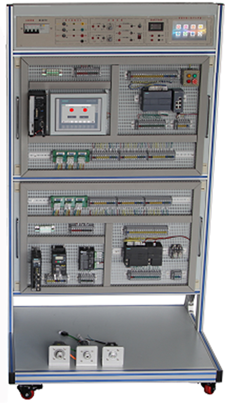 采用立式網(wǎng)孔板結(jié)構(gòu),由工業(yè)鋁型材搭建而成,上方為電源控制模塊,下方為網(wǎng)孔式安裝板。底部設(shè)有帶剎車萬向輪,方便移動布局。臺架尺寸約為1000×800×1800mm。 頂端電源模塊,提供實訓所需的三相交流380V、單相220V電源接口,具有啟動、停止、急停系統(tǒng),設(shè)有漏電保護、電源指示、過流保護等功能。設(shè)有DC24V控制電源,配有控制開關(guān)及輸出接口,帶短路保護功能。 |