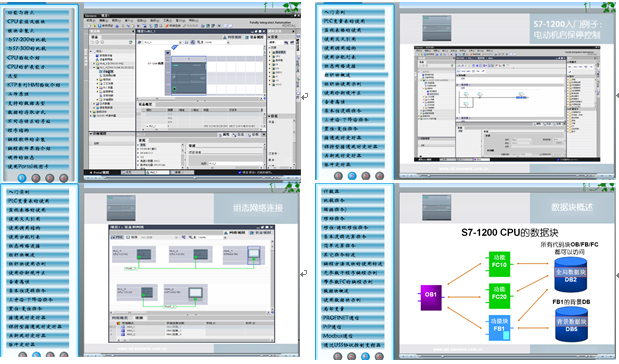 配有S7-1200 PLC學習軟件,方便老師教學,提供有功能與特點、模塊安裝、選型、工作原理、支持的數(shù)據(jù)類型、數(shù)據(jù)的存取方式、程序結(jié)構(gòu)、編程軟件的安裝、編程軟件界面介紹、硬件的組態(tài)、入門實例、PLC變量表的使用、使用交叉引用、組織塊使用示例、基本位邏輯指令、上升沿-下降沿指令、置位-復(fù)位指令、接通延時定時器、比較指令、移位-循環(huán)移位指令、基本邏輯運算指令、數(shù)據(jù)塊概述等50多個學習項目。PLC學習軟件參考界面如下: