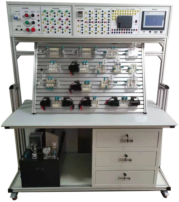 液壓實訓(xùn)元件均為透明有機材料制成,透明直觀。便于了解掌握幾十種常用液壓元件的結(jié)構(gòu)、性能及用途。掌握幾十種基本實訓(xùn)回路的工作過程及原理。實訓(xùn)時組裝實訓(xùn)回路快捷、方便。液壓實訓(xùn)電氣主控單元配備1套PLC控制與1套繼電器控制,簡單實用。