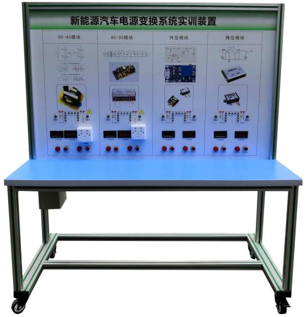 DC-AC模塊(12V轉(zhuǎn)220V)、點火開關、AC-DC模塊(220V轉(zhuǎn)12V)、升壓模塊(12V轉(zhuǎn)24V)、降壓模塊(24V轉(zhuǎn)12V)、發(fā)光二極管閃光燈燈條、指示燈、操作開關、接觸器、急停開關、一體化全鋁合金型材搭建的移動臺架(1500×700×1700mm 帶自鎖腳輪裝置,帶安裝檢測端子的原理面板,面板1448×940mm)、設備操作說明書。